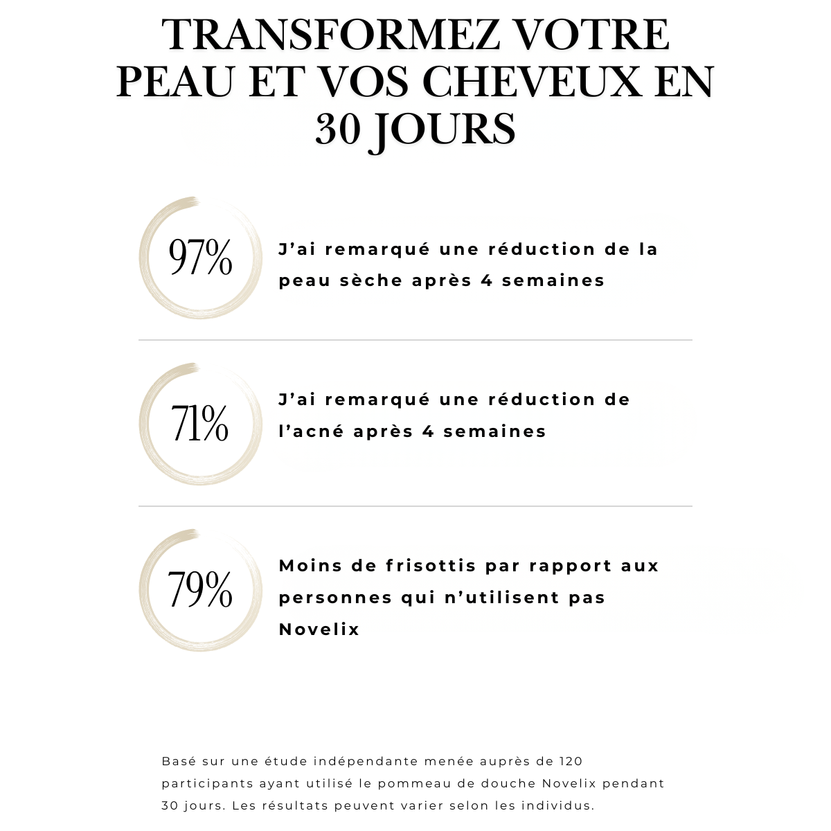 Basé sur une étude indépendante menée auprès de 120 participants ayant utilisé le pommeau de douche Novelix pendant 30 jours. Les résultats peuvent varier selon les individus.